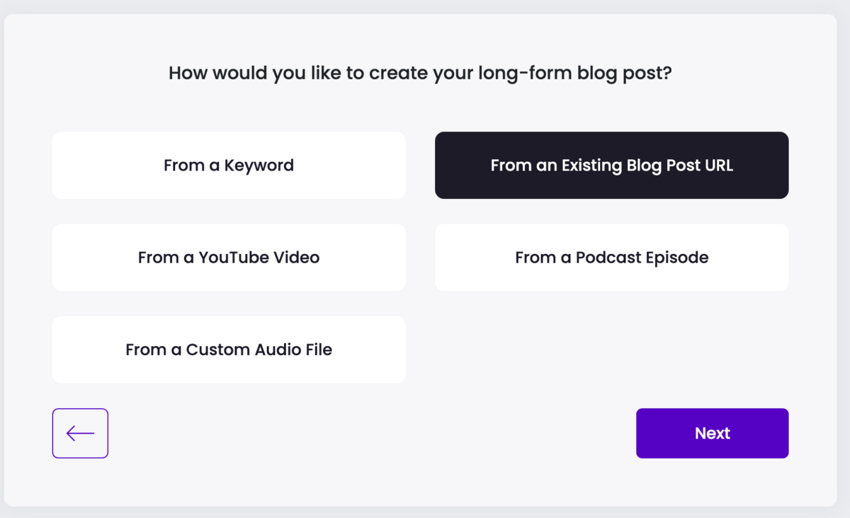I mentioned in this Monday’s Acquire The Web newsletter, that Content at Scale just had a huge content quality update, all new UI, and now the ability to create long form articles from existing blog URL's, YouTube videos and podcast episodes: