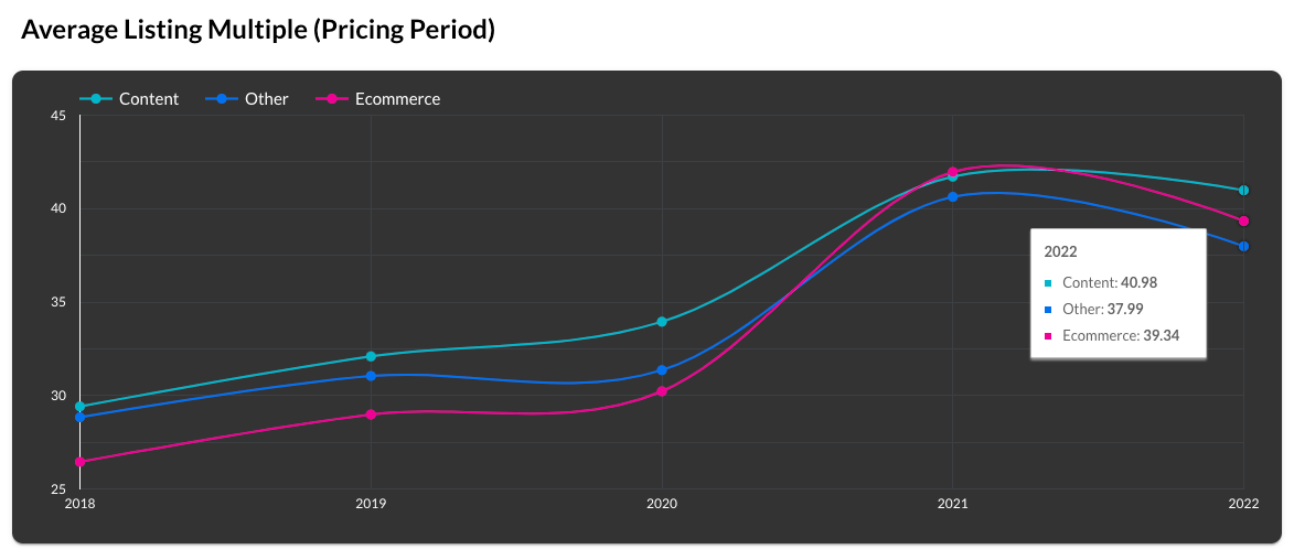 Content site multiples saw a slight drop to 40.98x in 2022 vs 41.71x in 2021: