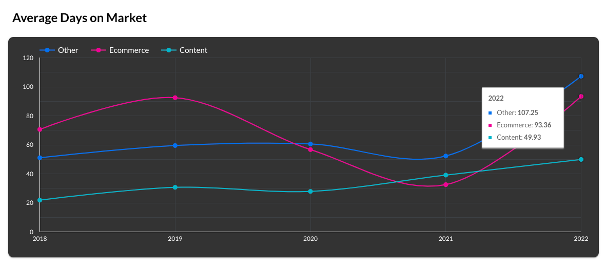 Content sites were on the market for an average of 39.15 days in 2021, and increased to 49.93 days in 2022. This business model represents the lowest number of days on the market of any business model, though there is a gradual increase from the 2018 and 2019 averages of 21.86 and 30.71 days respectively.